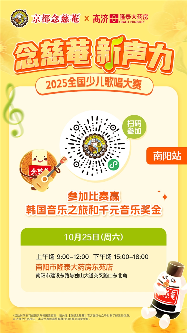 承载百年护嗓匠心,唱响新时代好声音!百年品牌京都念慈菴再度启幕少儿音乐盛宴—— 第三届 “念慈菴・新声力” 全国少儿歌唱大赛将在2025年10月25日至26日来到南阳开展线下海选。每段旋律,都是童心深处的回响;每次登台,都是成长路上的熠熠星芒。我们期待每个热爱音乐的孩子们,都能在梦想的舞台上尽情绽放,一起唱响念慈菴好声音,唱响未来!
