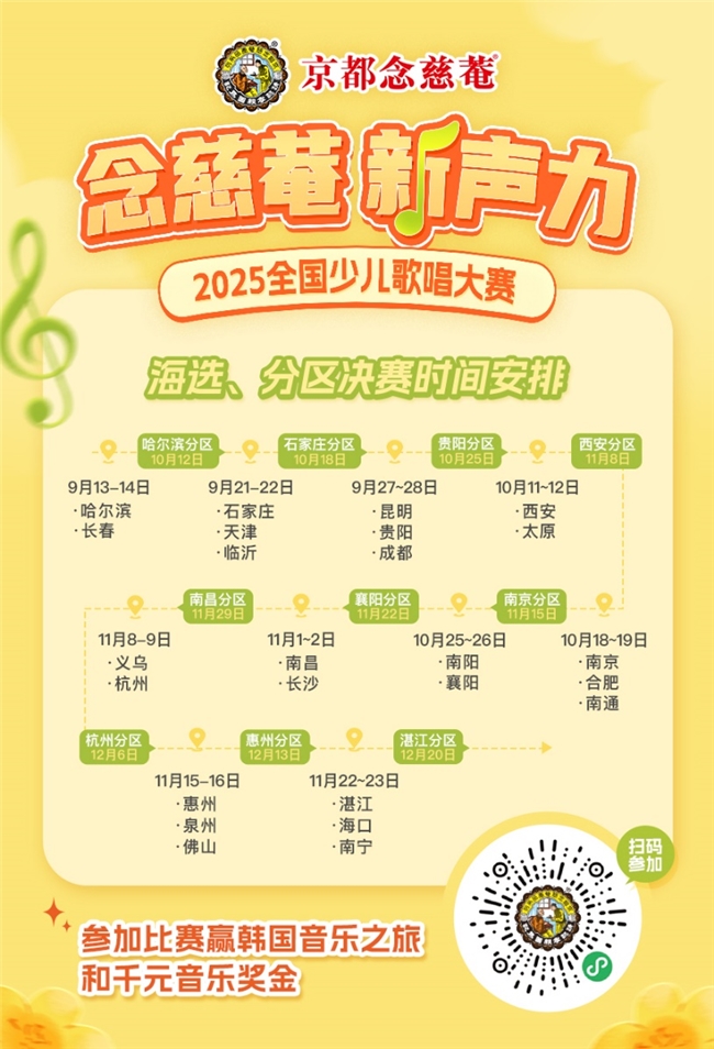 “念慈菴・新声力”不仅是展示的舞台,更是成长的阶梯!本次比赛的奖品丰厚,每一步进阶都有惊喜,助力孩子向音乐梦想靠近。全国25个城市海选后,晋级的小选手将来到10个城市分区决赛,最终决出全国40强进入2026年在广州举办的全国总决赛。参与全国总决赛不仅有千元音乐梦想奖金,还有望冲刺终极大奖——韩国音乐之旅!韩国作为亚洲流行音乐的重要发源地,拥有丰富的音乐资源和成熟的音乐产业。此次研学之旅不仅是一次简单的观光旅行,更是深度体验音乐文化、拓展国际视野的宝贵机会,必将成为小选手音乐道路上的重要里程碑。