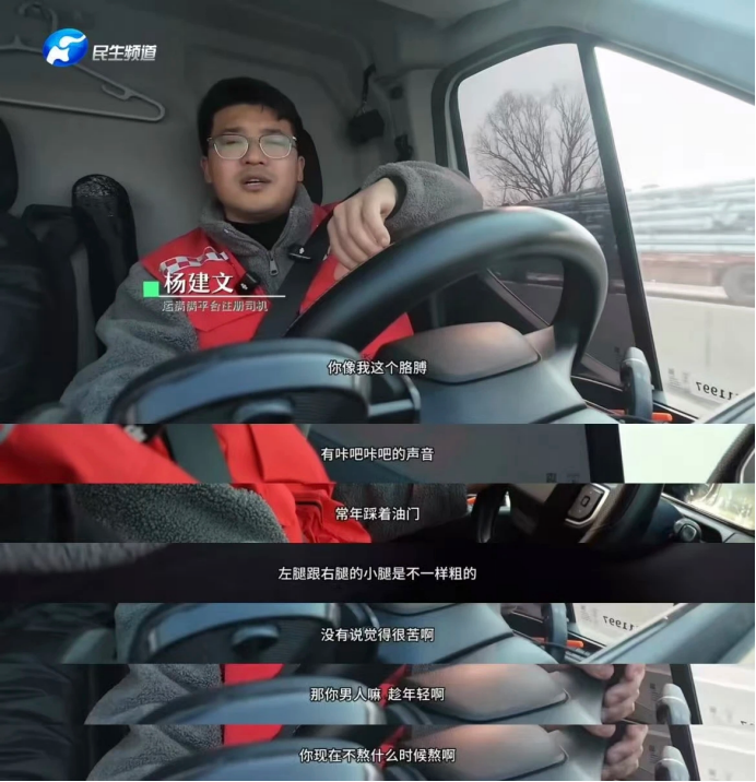 “你像我这个胳膊,有咔啪咔啪的声音;常年踩着油门,左腿跟右腿的小腿是不一样粗的。”这份工作对身体也是一个不小的考验,但是他很坦然,“我没觉得有啥,没有说觉得很苦啊很累啊。男人嘛,趁年轻啊,你现在不熬什么时候熬啊?”